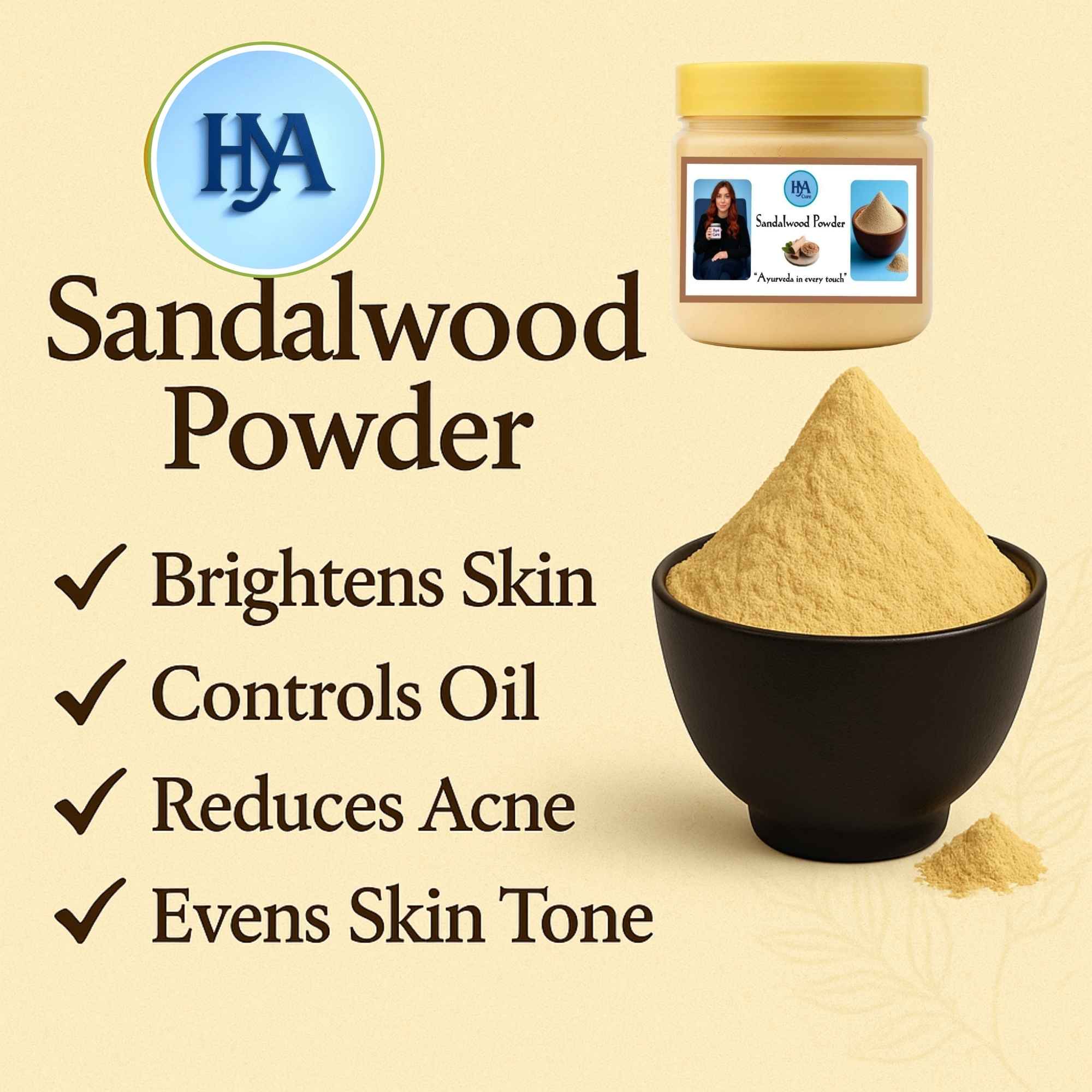 HYA CURE Sandalwood Powder is 100% pure, Ayurvedic and natural. It helps in removing acne, reducing oiliness, and improving skin tone. Best for face packs & tan removal.